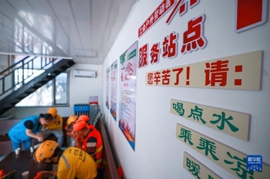 7月7日,在山東省榮成市觀海路東段一處戶外勞動(dòng)者“愛(ài)心驛站”,志愿者為環(huán)衛(wèi)工人、外賣配送員等戶外工作者沏茶、加水。
