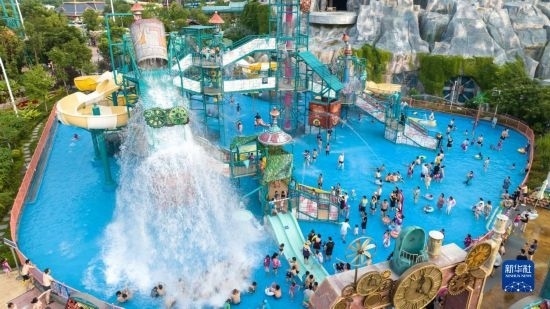 7月8日,游客在安徽省蕪湖市南陵縣大浦鄉(xiāng)村世界的海嘯館戲水游玩。