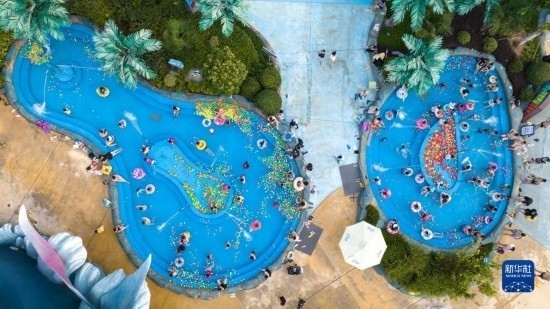 7月8日,游人在湖北省襄陽(yáng)市華僑城奇夢(mèng)海灘水樂園游玩(無(wú)人機(jī)照片)。