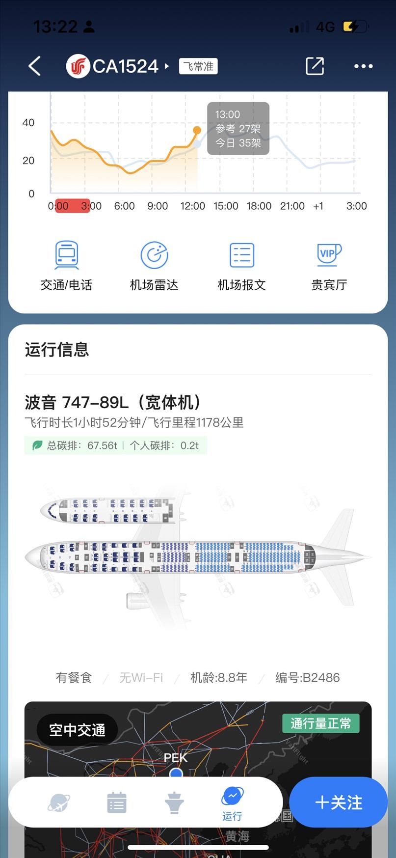 7月11日國(guó)航CA1524航班執(zhí)飛機(jī)型為波音747-89L。 飛常準(zhǔn)截圖