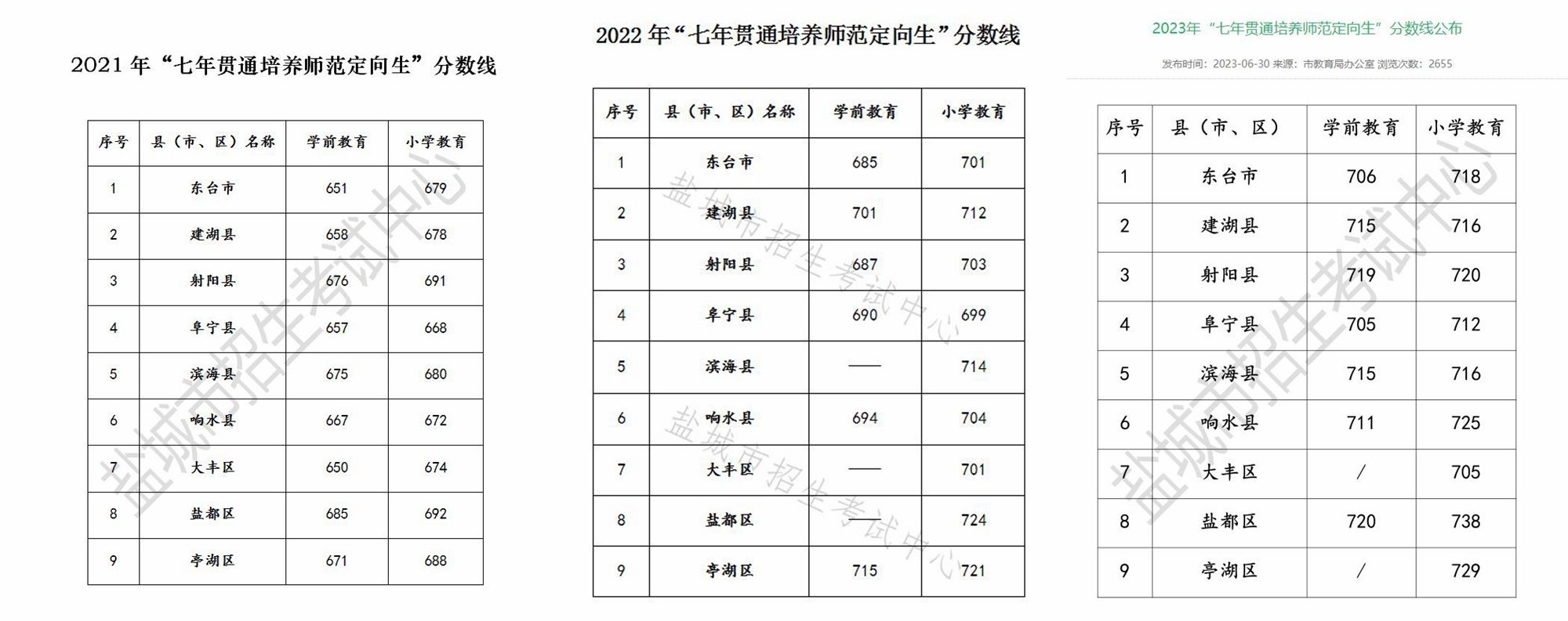 根據(jù)鹽城市教育局公布的2021年-2023年“七年貫通培養(yǎng)師范定向生”分數(shù)線來看,該項目的錄取分數(shù)線也在逐年升高。學前教育專業(yè)錄取分數(shù)線從最高685分升至最高720分,小學教育專業(yè)錄取分數(shù)線從最高692升至最高738分。