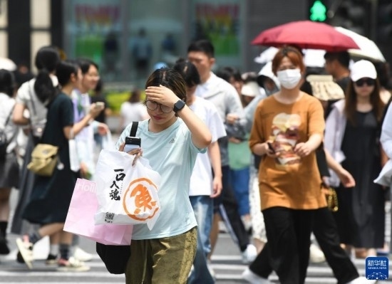 7月10日,行人在杭州湖濱商圈過馬路。