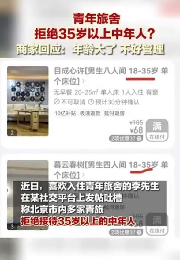 近日,#青旅不接待35歲以上人群#話題沖上熱搜,引發(fā)熱議。該話題源于一網友發(fā)布的帖子。該帖子表示,某平臺上北京不少青旅商家拒絕年齡35歲以上的人群入住。該網友詢問原因,得到的回答是“年齡大的上下床不安全容易出事?!睂Υ舜饛停簧倬W友不能認同,認為是“借口”。