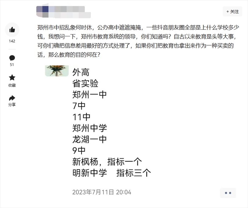 7月16日,有群眾通過(guò)頂端新聞“我想@領(lǐng)導(dǎo)”平臺(tái)向鄭州市教育局局長(zhǎng)留言:“掏錢(qián)就能上?鄭州中招販賣(mài)名額成風(fēng)”“公開(kāi)賣(mài)高中名額,鄭州教育局都不管嗎”等類(lèi)似留言。