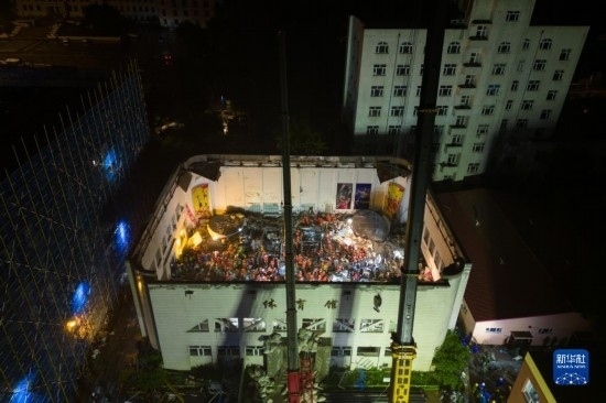 7月24日,消防救援人員在齊齊哈爾市第34中學體育館樓頂坍塌事故現(xiàn)場救援。新華社記者 張濤 攝