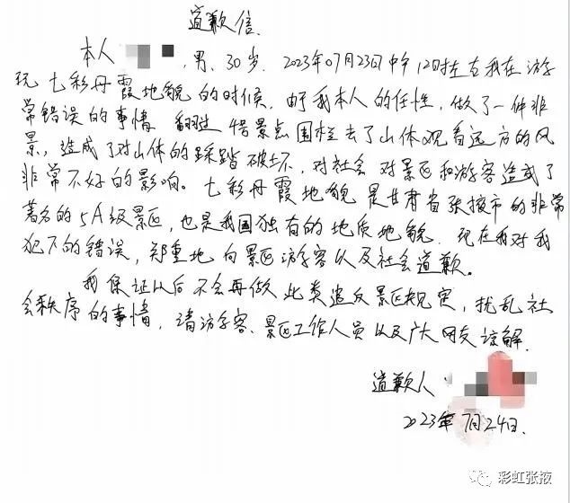 同時(shí),張掖丹霞大景區(qū)管理委員會(張掖國家地質(zhì)公園管理局)微信公眾號還發(fā)布了這名游客的道歉信。該游客稱“由于本人的任性,做了一件非常錯(cuò)誤的事情,翻過4號景點(diǎn)圍欄去了山體觀看遠(yuǎn)方的風(fēng)景,造成了對山體的踩踏破壞,對社會、對景區(qū)和游客造成了非常不好的影響。”
