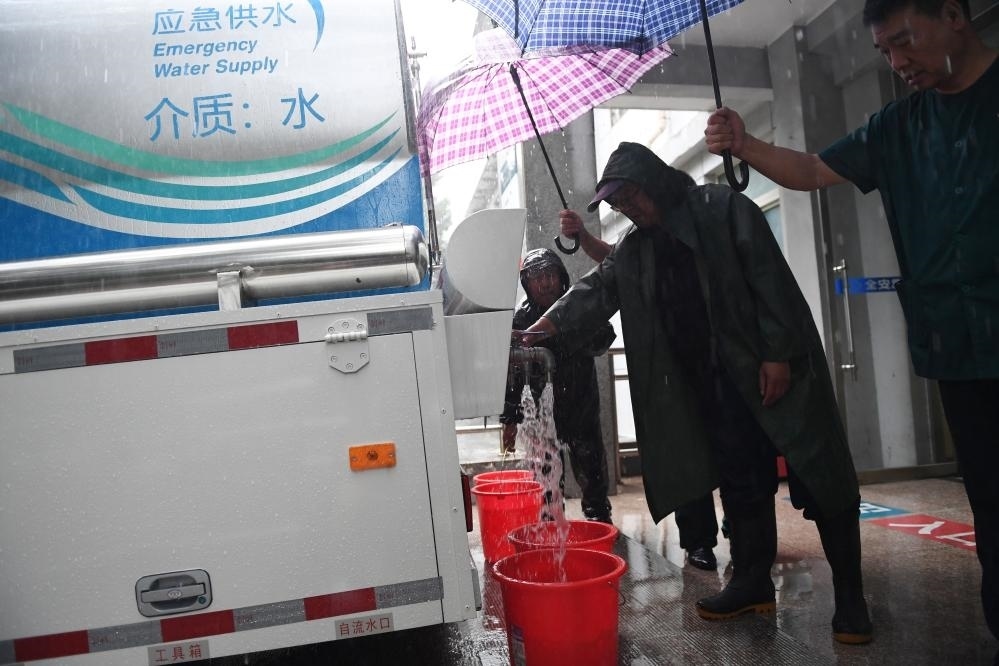 位于門頭溝區(qū)永定鎮(zhèn)的上岸療養(yǎng)院31日中午停水,之后工作人員在雨中迎來了應(yīng)急供水車,并組織看護人員集中取水。北京市自來水集團介紹,該集團門頭溝城子水廠擋水墻被沖垮,配水機房進水導(dǎo)致全廠停水,影響門頭溝區(qū)門城等地區(qū)約15萬戶正常供水。目前有45輛應(yīng)急供水車向停水地區(qū)進行應(yīng)急供水,優(yōu)先前往養(yǎng)老院、醫(yī)院等地。