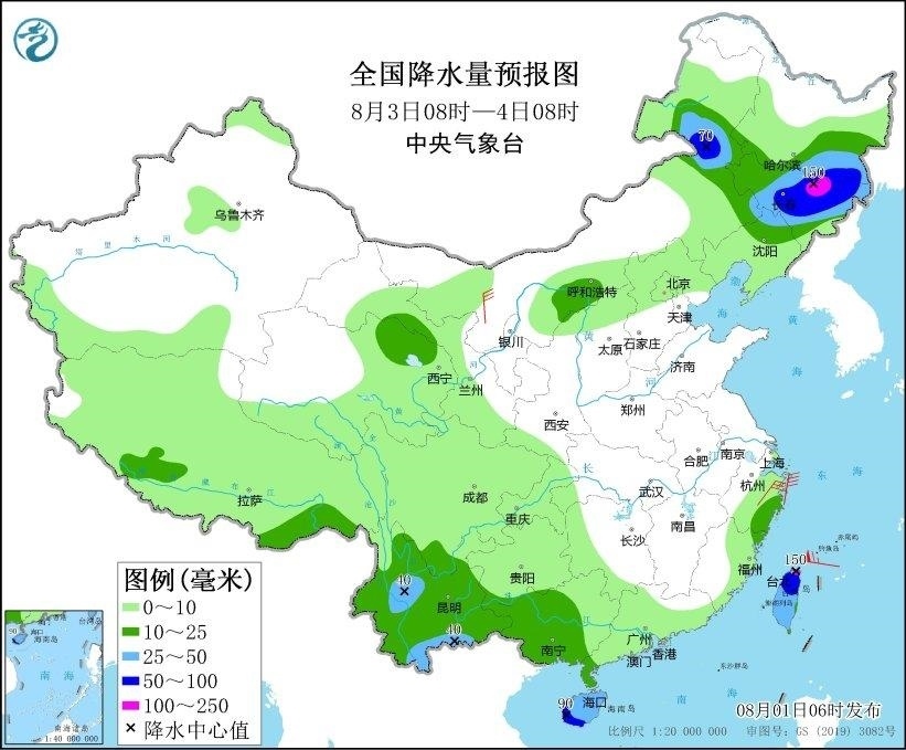 8月3日08時至4日08時,內(nèi)蒙古河套地區(qū)和東北部、黑龍江南部、吉林、西藏南部、云南、廣西中西部、海南島、臺灣島等地部分地區(qū)有中到大雨,其中,內(nèi)蒙古東北部、黑龍江東南部、吉林中東部、海南島西南部、臺灣島北部等地局地有暴雨或大暴雨(100~150毫米)。內(nèi)蒙古西北部、浙江北部等地部分地區(qū)有5~6級風(fēng)(見圖3)。