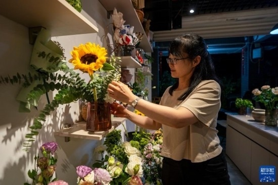 8月3日,在昆明的一家花店,店主在打理鮮花。新華社記者 陳欣波 攝