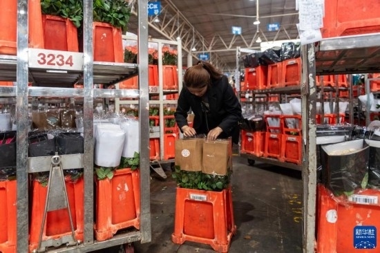 一名工作人員在昆明國際花卉拍賣交易中心內(nèi)對臺車上存放的鮮花進行掃碼(7月13日攝)。新華社記者 陳欣波 攝