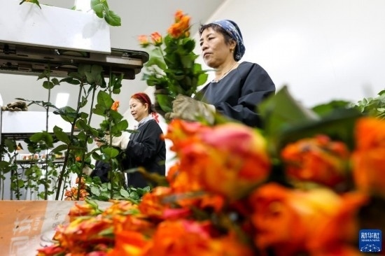在云天化晉寧花卉產(chǎn)業(yè)現(xiàn)代化示范園內(nèi),花農(nóng)對鮮花進行簡單打包(7月12日攝)。新華社記者 陳欣波 攝