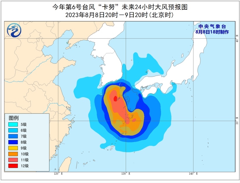 受“卡努”影響,8月8日至9日,巴士海峽、臺灣海峽北部、臺灣以東洋面、東海南部和東部及釣魚島附近海域有6級至7級大風(fēng),東海東部部分海域風(fēng)力可達8級至10級,“卡努”中心經(jīng)過的附近海域風(fēng)力可達11級至12級,陣風(fēng)13級至14級。