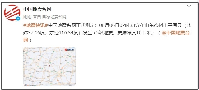 ·山東德州市平原縣發(fā)生5.5級(jí)地震,震源深度10公里,河南、河北等地震感強(qiáng)烈。已發(fā)生余震52次,有10人受傷,濟(jì)南啟動(dòng)三級(jí)應(yīng)急響應(yīng)。