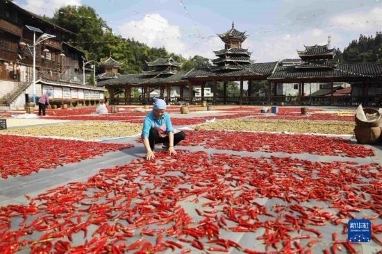 8月11日,在貴州省黔東南苗族侗族自治州錦屏縣大同鄉(xiāng)秀洞村,村民在晾曬辣椒。