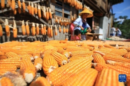 8月11日,在貴州省黔東南苗族侗族自治州從江縣往洞鎮(zhèn)增沖村,村民在晾曬玉米。