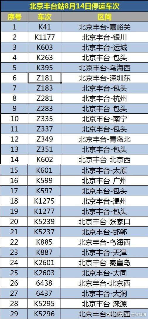 央視網(wǎng)消息:據(jù)@北京西站官方微博 消息,受水害影響,8月14日北京西站、北京豐臺(tái)站部分列車停運(yùn),已購買停運(yùn)列車車票的旅客,可于30日內(nèi)辦理全額退票手續(xù)。