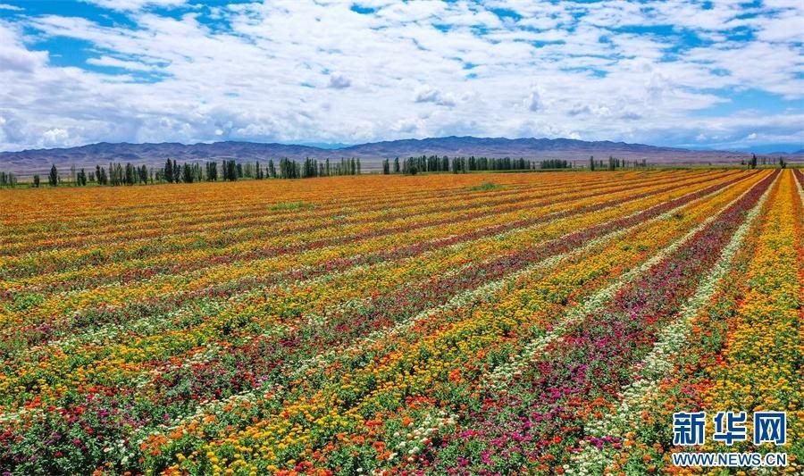 位于天山腳下的新疆昌吉回族自治州呼圖壁縣石梯子鄉(xiāng)白楊河村600畝百日草花開成海,吸引眾多游客前來賞景拍照。
