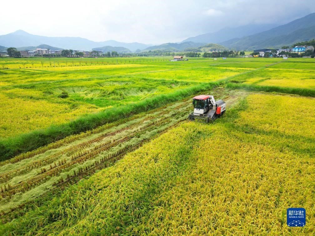 8月17日,收割機(jī)在福建省南平市浦城縣石陂鎮(zhèn)申明村田間收割水稻(無(wú)人機(jī)照片)。