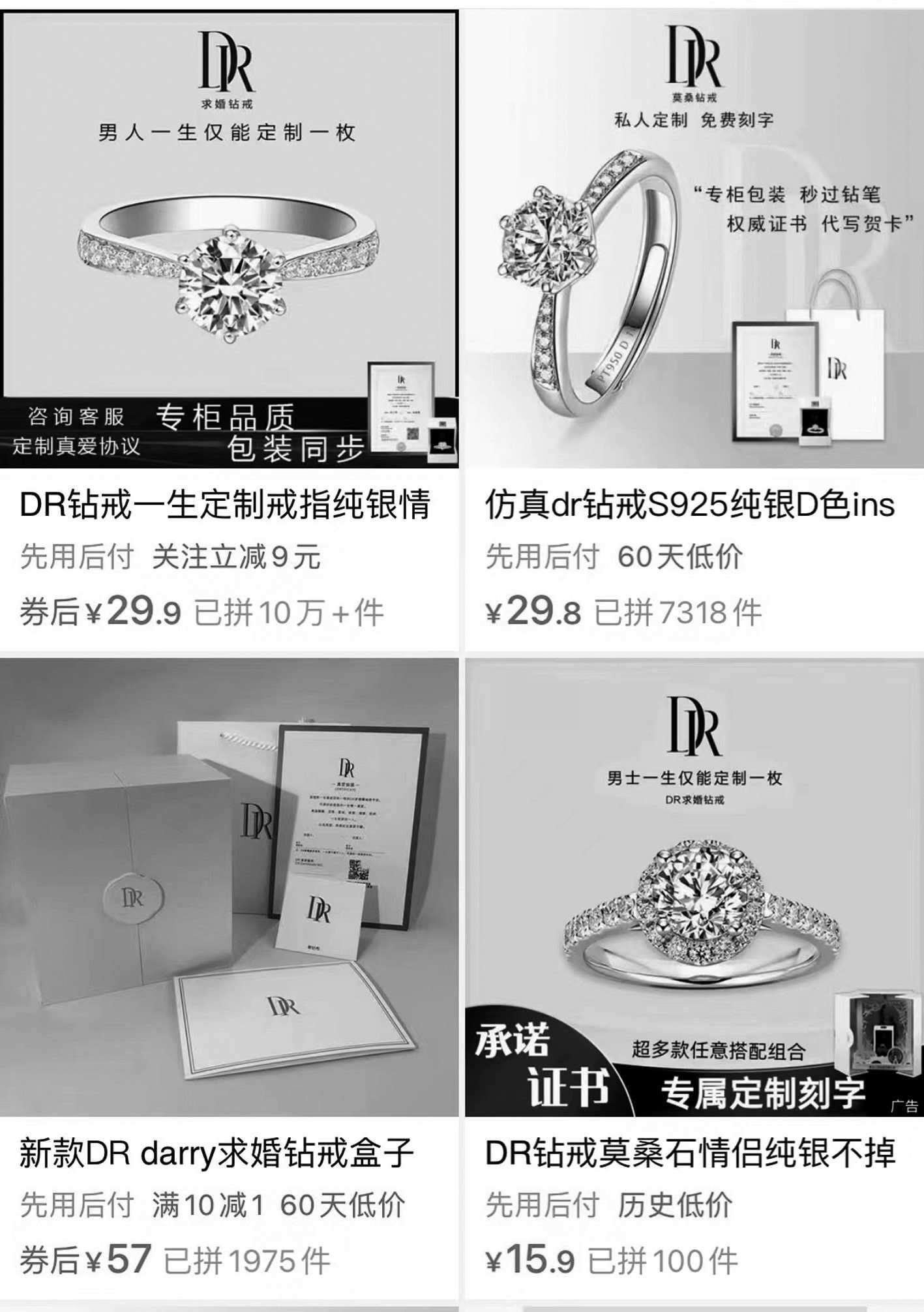 記者在一家電商平臺輸入“DR鉆戒”,映入眼簾的商品售價只要幾十塊,幾乎都把“男士一生僅能定制一枚”作為賣點。還有商家寫道,“專柜品質、包裝同步”“咨詢客服定制真愛協議”。