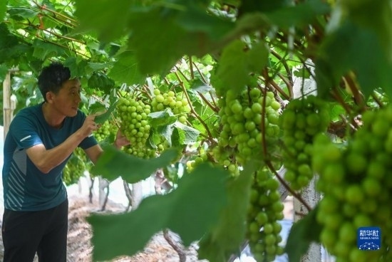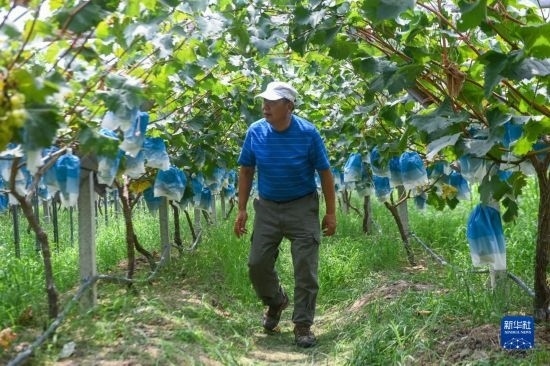 8月20日,在諸暨市姚江鎮(zhèn)紫草塢村阿群家庭農(nóng)場的葡萄大棚內(nèi),種植戶壽怒濤查看葡萄的成熟度。壽怒濤通過農(nóng)技培訓(xùn)學(xué)習(xí)葡萄種植新技術(shù),提高葡萄的口感和產(chǎn)量。