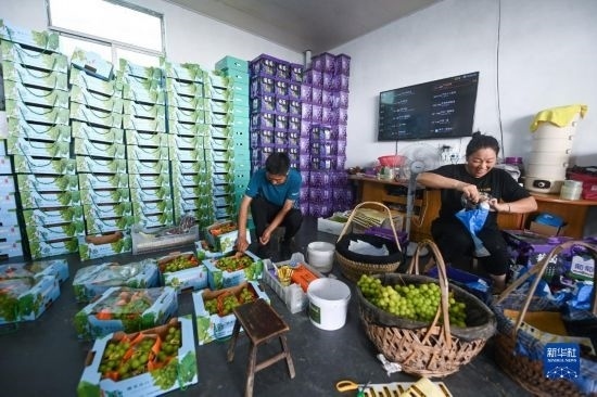 8月20日,在諸暨市姚江鎮(zhèn)紫草塢村阿群家庭農(nóng)場內(nèi),種植戶打包成熟的葡萄,準(zhǔn)備運往市場。