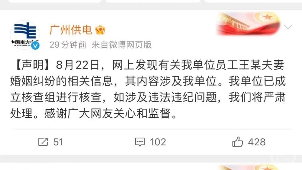 8月22日晚間,廣州供電局官方社交賬號發(fā)布聲明稱:“8月22日,網(wǎng)上發(fā)現(xiàn)有關(guān)我單位員工王某夫妻婚姻糾紛的相關(guān)信息,其內(nèi)容涉及我單位。我單位已成立核查組進(jìn)行核查,如涉及違法違紀(jì)問題,我們將嚴(yán)肅處理。感謝廣大網(wǎng)友關(guān)心和監(jiān)督。”