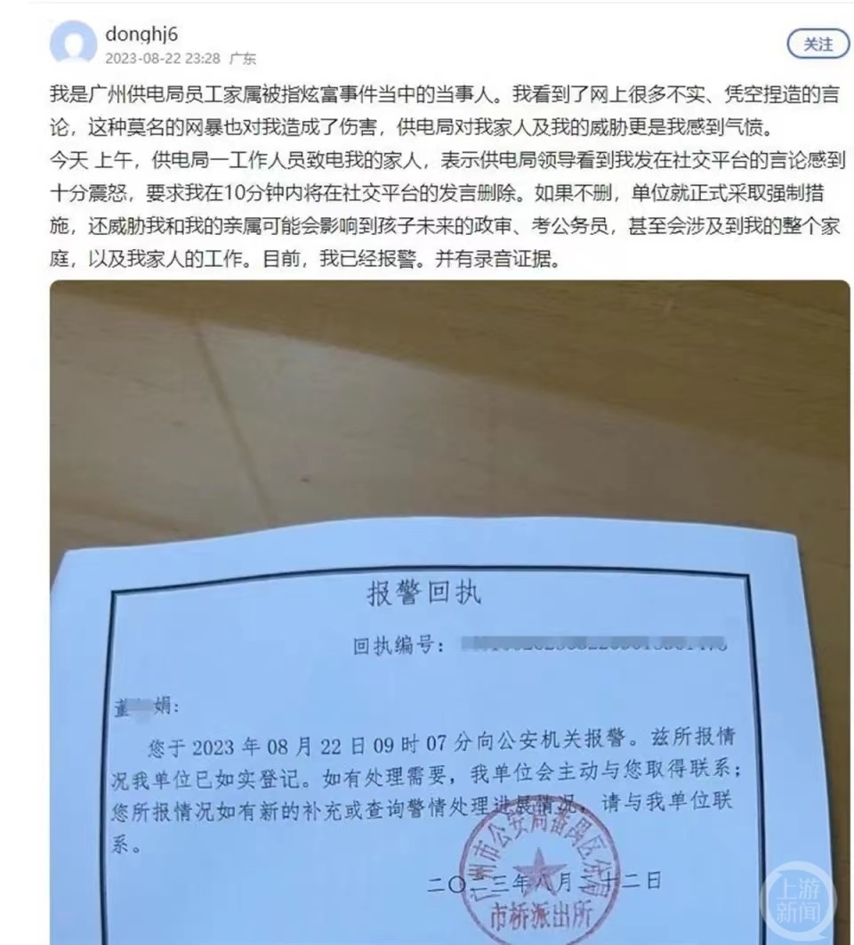 22日晚23時,自稱是舉報當(dāng)事人阿娟的網(wǎng)友發(fā)布了報警回執(zhí),并發(fā)帖稱當(dāng)日上午,供電局一工作人員致電她的家人,“表示供電局領(lǐng)導(dǎo)看到我發(fā)在社交平臺的言論感到十分震怒,要求我在10分鐘內(nèi)將在社交平臺的發(fā)言刪除。如果不刪,單位就正式采取強制措施,還威脅我和我的親屬,(此舉)可能會影響到孩子未來的政審、考公務(wù)員,甚至?xí)婕暗轿业恼麄€家庭,以及我家人的工作。目前,我已經(jīng)報警。并有錄音證據(jù)?!?/p>