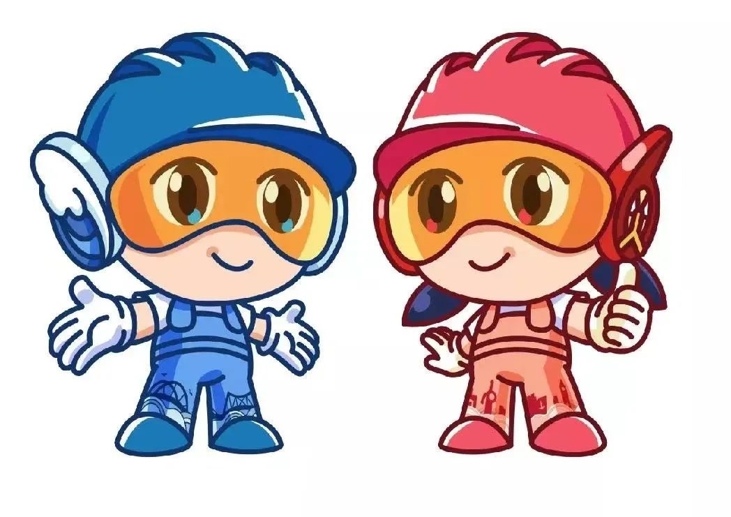 本屆大賽的吉祥物為“天天、津津”,形象為“一男、一女”兩個(gè)青年人物的造型,具有青春、活力、向上的鮮明特點(diǎn),色彩以藍(lán)色、紅色為主色調(diào),突出“技能藍(lán)、青春紅”,與大賽會(huì)標(biāo)“技”字標(biāo)識(shí)相呼應(yīng);服飾上通過統(tǒng)一的工裝服、安全帽、護(hù)目鏡、藍(lán)牙耳機(jī)等外形設(shè)計(jì),形象鮮明地展現(xiàn)新時(shí)代技能人才的外表特征;通過人物專注自信的表情和張開雙臂、舉手點(diǎn)贊等形態(tài),凸顯了技能人才“力爭(zhēng)上游、奮勇拼搏”的精神面貌和天津人民“自信包容、樂觀好客”的性格特質(zhì)。同時(shí),通過摩天輪造型耳機(jī)、特色橋梁、港口、天津新老標(biāo)志性建筑等形象設(shè)計(jì),展現(xiàn)天津的城市元素。