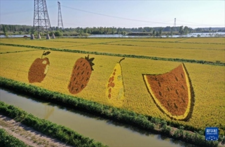 初秋時(shí)節(jié),遼寧省鞍山市臺(tái)安縣遼河文化旅游景區(qū)的稻田畫吸引不少游客前來參觀游覽。由多種顏色組成的巨型稻田畫勾勒出豐收壯美景象。