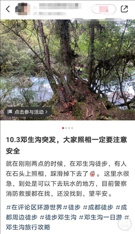 10月3日,游客艾女士(化名)發(fā)布圖片稱,當天下午2點左右,在鄧生溝徒步,有人照相時踩滑掉落水里,水流非常湍急?!笆钦驹谑^上照相,踩滑了掉下去。聽到落水者兒子哭著給家里人打電話說的?!彼€向上游新聞記者表示,落水者是一位女游客,事情發(fā)生后,警方、消防等都在展開救援。多位游客表示,該女游客已被找到,不過已經去世。