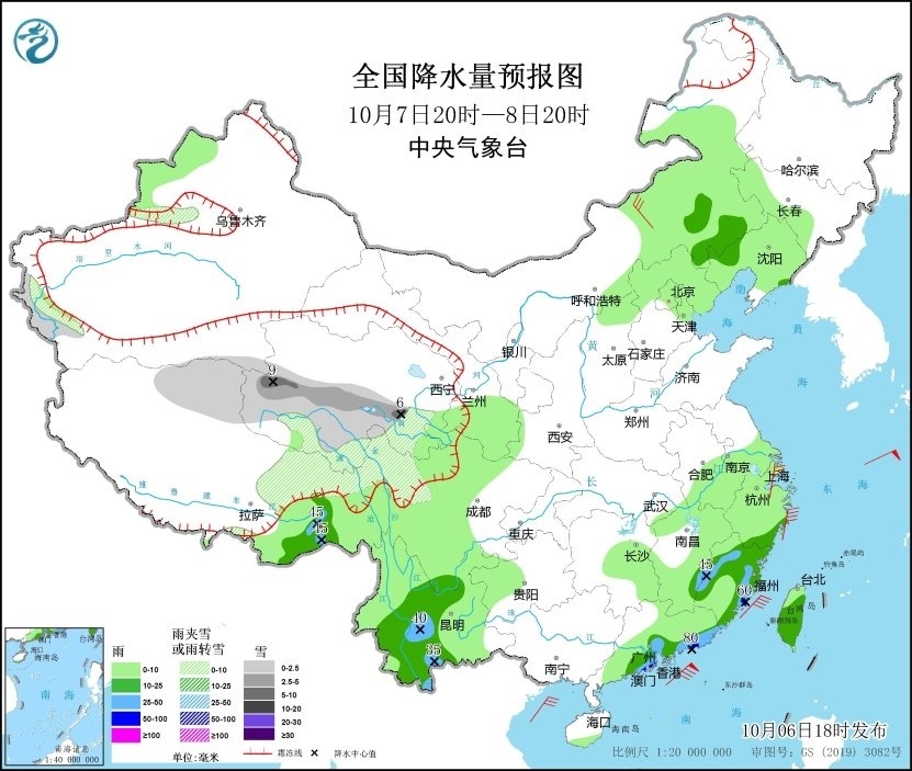 10月6日20時(shí)至7日20時(shí),新疆南疆盆地西部沿山地區(qū)、青海南部、西藏東部等地有小到中雪或雨夾雪;西藏東南部、四川盆地東部和南部、云南中東部、福建中南部、廣東東部、海南島南部、臺(tái)灣島西部等地部分地區(qū)有中到大雨,其中,廣東東部和福建南部沿海等地局部地區(qū)有暴雨(50~65毫米)。內(nèi)蒙古中東部、遼東半島、浙江東部沿海等地部分地區(qū)有4~6級(jí)風(fēng),西藏中部部分地區(qū)有6~7級(jí)風(fēng)。臺(tái)灣海峽將有6~7級(jí)、陣風(fēng)8級(jí)的東北風(fēng),南海東北部海域?qū)⒂?~9級(jí)、陣風(fēng)10級(jí)的偏北風(fēng)(見(jiàn)圖1)。