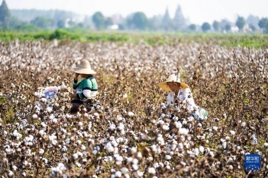 金秋十月,湖南省益陽(yáng)市南縣種植的4萬(wàn)余畝棉花相繼進(jìn)入采收季,當(dāng)?shù)孛揶r(nóng)趁著晴好天氣采摘棉花,田間地頭一片忙碌的景象。