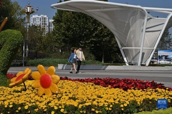 10月15日,市民從唐山市海港經(jīng)濟(jì)開發(fā)區(qū)城市休閑驛站走過。