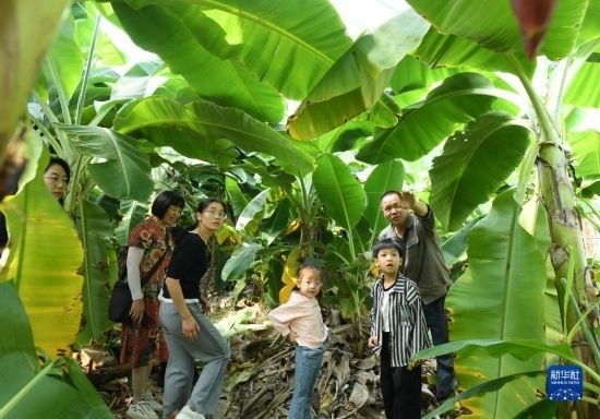 10月18日,在浬浦鎮(zhèn)陶姚村的香蕉大棚內(nèi),兒童在了解香蕉的生長(zhǎng)習(xí)性。