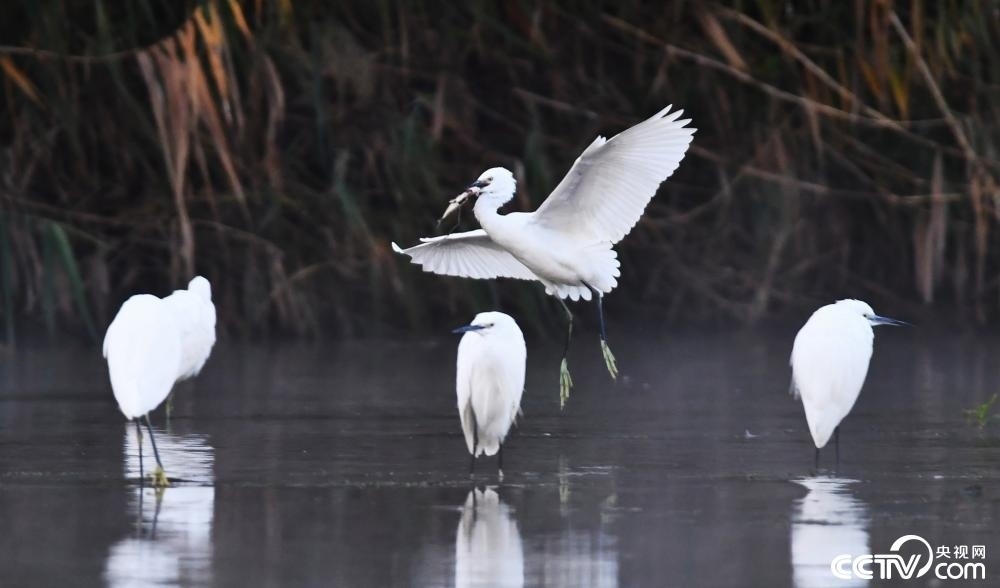 金秋時節(jié),白鷺在山東省滕州市上善公園水域飛舞、嬉戲、覓食。