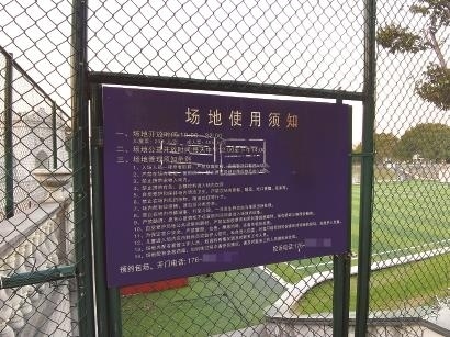 賢園足球場(chǎng)的“場(chǎng)地使用須知”牌。從上面羅列的條款得知,該球場(chǎng)僅中午12時(shí)至下午2時(shí)是公益免費(fèi)開放時(shí)段。?