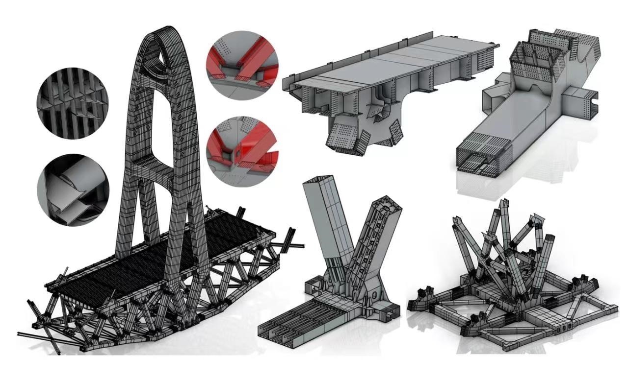 “本橋曲線鋼桁梁構(gòu)造異常復(fù)雜,鋼塔外形為半橢圓變截面,桁架近萬根桿件空間定位要求嚴(yán)絲合縫。為了準(zhǔn)確表達(dá)每個(gè)細(xì)節(jié),我們采用了BIM正向設(shè)計(jì)思路,探索出設(shè)計(jì)—建模—成圖一體化的設(shè)計(jì)流程,開發(fā)出自動(dòng)化建模功能和智能化出圖系統(tǒng),為施工企業(yè)和鋼梁制造廠提供高精度的模型和批量圖紙,精準(zhǔn)表達(dá)復(fù)雜的結(jié)構(gòu)信息和設(shè)計(jì)意圖,打通了設(shè)計(jì)—制造—施工全過程信息傳遞路徑,有效節(jié)約了工期與造價(jià)?!敝需F設(shè)計(jì)集團(tuán)大橋項(xiàng)目主管總工彭嵐平向我們講述了大橋采用的最新智能化設(shè)計(jì)手段。