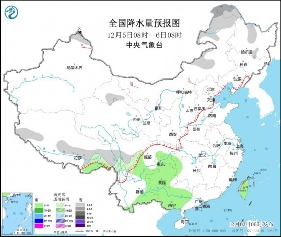 全國(guó)降水量預(yù)報(bào)圖(12月5日08時(shí)-6日08時(shí))