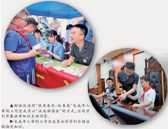 “‘紅青庭’品牌Logo中,‘紅’字既突出黨建統(tǒng)領(lǐng)又寓意紅領(lǐng)巾,是百折不撓的精神象征;‘青’字代表著青少年,是肩負(fù)未來的青春力量;‘庭’字則是指少年法庭和家庭。”胡衛(wèi)民介紹,柯城區(qū)法院依托“浙里春風(fēng)·紅青庭”品牌,成立青少年法治教育實(shí)踐基地和未成年人審判工作室,積極開展內(nèi)外聯(lián)動,在持續(xù)加強(qiáng)涉未成年人刑事、民事、行政審判融合的基礎(chǔ)上,不斷深化與公安、檢察、教育、團(tuán)委、婦聯(lián)等部門的協(xié)調(diào)配合,構(gòu)筑全方位、多鏈條的綜合司法保護(hù)機(jī)制。