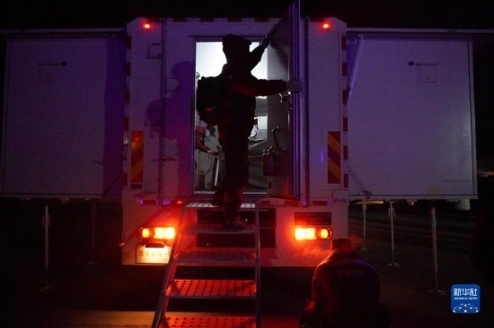 12月19日,在甘肅省臨夏回族自治州積石山保安族東鄉(xiāng)族撒拉族自治縣大河家鎮(zhèn)大河村,醫(yī)務(wù)工作人員搭建救援平臺(tái)。