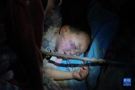 12月19日,在甘肅省臨夏回族自治州積石山保安族東鄉(xiāng)族撒拉族自治縣積石山縣中西醫(yī)結(jié)合醫(yī)院門(mén)口,一名受傷兒童得到安置和初步診療后熟睡。