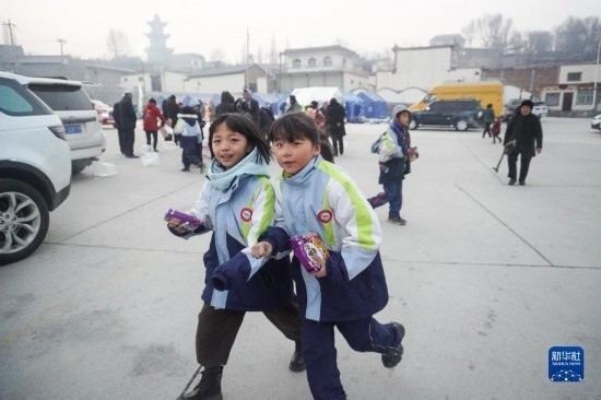 12月19日,在甘肅省臨夏回族自治州積石山保安族東鄉(xiāng)族撒拉族自治縣大河家鎮(zhèn)大河村,兩名女孩在領(lǐng)取物資。