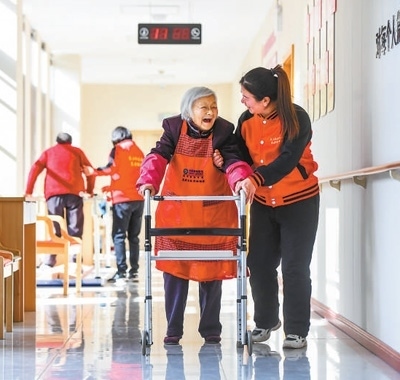 江西宜春市袁山社區(qū)養(yǎng)老服務中心工作人員在陪老人散步。 周 亮攝(人民視覺)