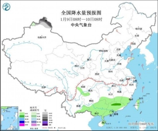 全國(guó)降水量預(yù)報(bào)圖(1月9日08時(shí)-10日08時(shí)) 來(lái)源:中央氣象臺(tái)網(wǎng)站
