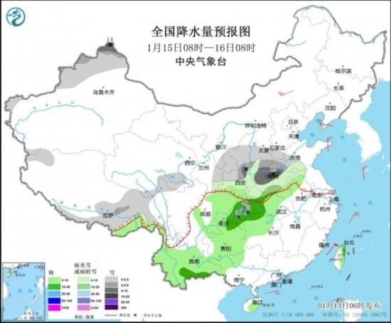 全國降水量預(yù)報(bào)圖(1月14日08時(shí)-15日08時(shí))