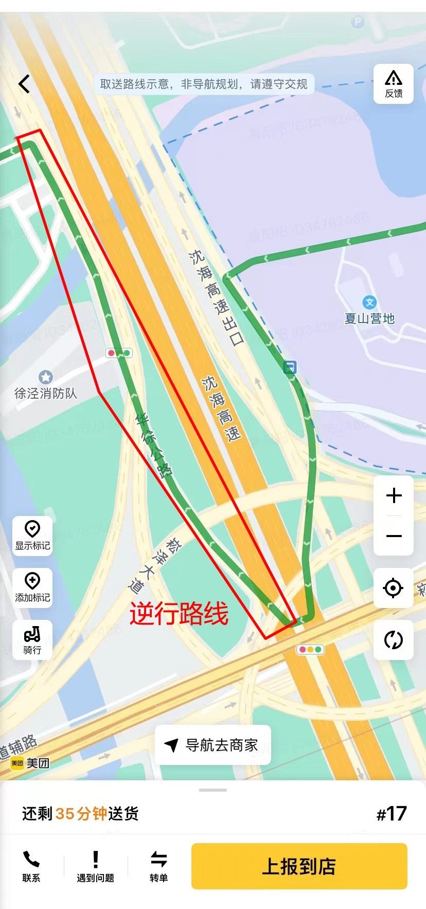 記者與陳陽陽取得了聯(lián)系,他發(fā)來3張逆行路線截圖,都是他這幾天日常送餐中遇到的。一單為從蟠龍?zhí)斓厮屯m韻文化中心,平臺(tái)規(guī)劃的騎行路線為先沿潘鼎路向南抵達(dá)崧澤高架路,再沿著崧澤高架路北側(cè)輔道向東,抵達(dá)蟠龍路后再向南……“崧澤高架北側(cè)輔道只能由東向西行駛,平臺(tái)讓沿著輔道向東騎行,這不是在逆行嗎?”陳陽陽稱,合理的路線應(yīng)沿潘鼎路向北,接著從龍聯(lián)路向東,再?gòu)捏待埪废蚰?,但這樣繞一圈會(huì)增加300米。