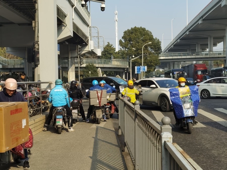 這也不是僅限青浦區(qū)。調(diào)查發(fā)現(xiàn),一些區(qū)域騎手逆行現(xiàn)象集中,背后都有平臺(tái)的“功勞”。在“12345”,有市民投訴逸仙路上騎手逆行現(xiàn)象突出,尤其是在安汾路殷高西路等路口。1月9日近中午時(shí)分,記者又來到該路段。逸仙路西側(cè)近殷高西路路口處,是名為“寶山新業(yè)坊”的商圈,外賣業(yè)務(wù)集中。記者觀察發(fā)現(xiàn),大量騎手取餐后若要向北送餐,無一例外都是直接沿逸仙路西側(cè)逆行向北,沒有騎手會(huì)向南五六百米到安汾路繞行過街后再向北。以至于逸仙路殷高西路路口南北向紅燈時(shí),等燈的逆行騎手能排成一排。