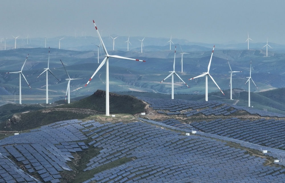 這是2023年9月2日拍攝的承德市豐寧滿族自治縣萬(wàn)勝永鄉(xiāng)萬(wàn)勝永村附近的一處風(fēng)光互補(bǔ)發(fā)電場(chǎng)(無(wú)人機(jī)照片)。新華社記者楊世堯 攝