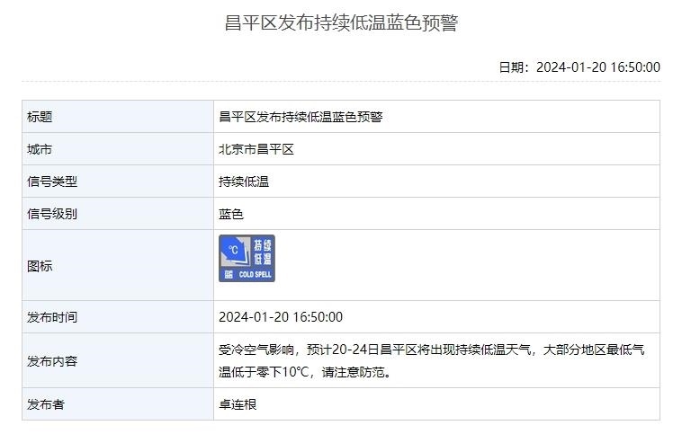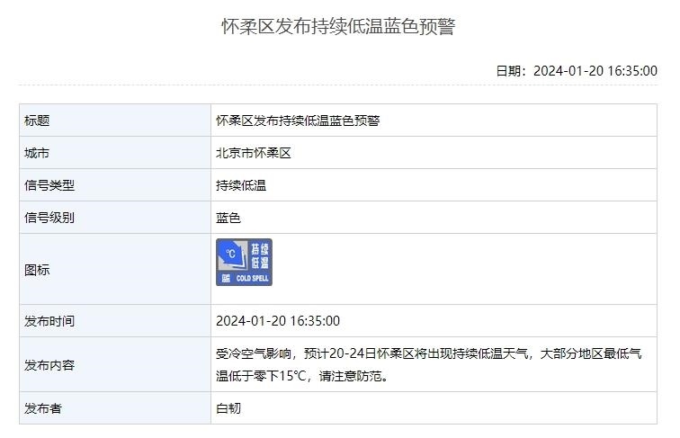 1月20日,北京延慶、懷柔、昌平3區(qū)發(fā)布持續(xù)低溫藍色預警。受冷空氣影響,預計20—24日這3個區(qū)將出現(xiàn)持續(xù)低溫天氣,其中延慶、懷柔兩地大部分地區(qū)氣溫低于零下15℃,請注意防范。