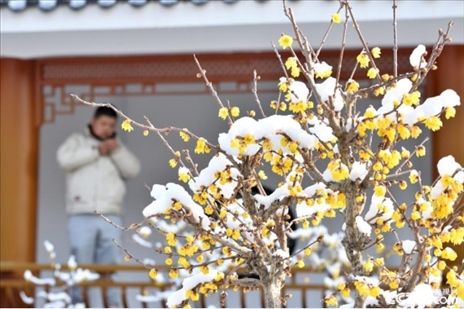2024年1月22日,一場大雪過后,湖北省襄陽市??悼h蠟梅公園內(nèi)的蠟梅傲雪綻放,黃色的蠟梅和白色的積雪相映成趣,美不勝收。